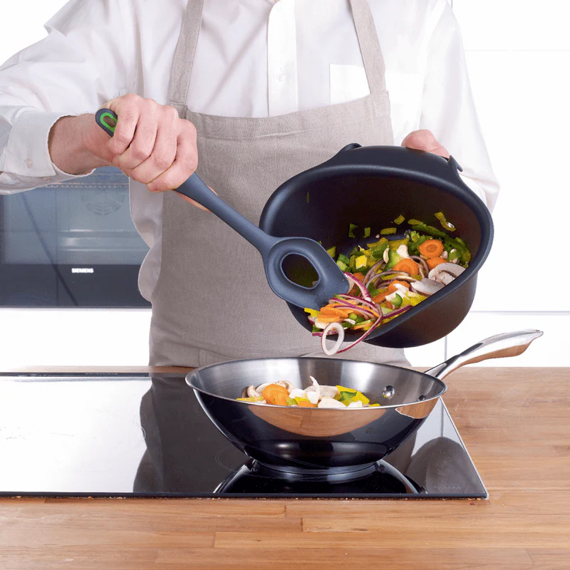 Vous pouvez ensuite les verser facilement dans votre casserole sans dégâts. La poignée est conçue pour s’accrocher aux tiroirs, ce qui permet de gagner un espace précieux sur le plan de travail.